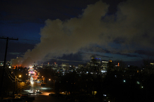 On Sunday night, the fire filled the city's skies with thick, billowing smoke reportedly visible from as far away as Davis County to the north. Before crews could control the flames, the scene's nighttime skies also sparked with glowing, swirling embers.