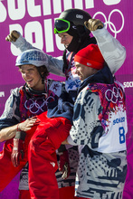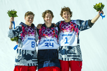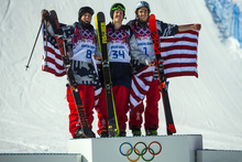 Gus Kenworthy, left, Joss Christensen, center, and Nick Goepper celebrate after the men's ski slopestyle competition at Rosa Khutor Extreme Park during the 2014 Sochi Olympics Thursday February 13, 2014. Joss Christensen, of Park City, Utah, won the gold medal with a score of 95.80. Gus Kenworthy, of Telluride, Colo., won the silver with a 93.60. Nick Goepper, of Lawrenceburg, Ind., won the bronze with a 92.40. It marked only the third time that the United States has swept the medals in an Olympic Winter Games event.