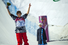 Gus Kenworthy celebrates after the men's ski slopestyle competition at Rosa Khutor Extreme Park during the 2014 Sochi Olympics Thursday February 13, 2014. Joss Christensen, of Park City, Utah, won the gold medal with a score of 95.80. Gus Kenworthy, of Telluride, Colo., won the silver with a 93.60. Nick Goepper, of Lawrenceburg, Ind., won the bronze with a 92.40. It marked only the third time that the United States has swept the medals in an Olympic Winter Games event.