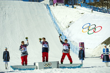 Gus Kenworthy, left, Joss Christensen, center, and Nick Goepper celebrate after the men's