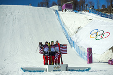 Nick Goepper and Gus Kenworthy hold up Joss Christensen in celebration after the men's ski slopestyle competition at Rosa Khutor Extreme Park during the 2014 Sochi Olympics Thursday February 13, 2014. Joss Christensen, of Park City, Utah, won the gold medal with a score of 95.80. Gus Kenworthy, of Telluride, Colo., won the silver with a 93.60. Nick Goepper, of Lawrenceburg, Ind., won the bronze with a 92.40. It marked only the third time that the United States has swept the medals in an Olympic Winter Games event.