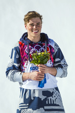 Gus Kenworthy walks from the flower ceremony after the men's ski slopestyle competition at Rosa Khutor Extreme Park during the 2014 Sochi Olympics Thursday February 13, 2014. Joss Christiensen, of Park City, Utah, won the gold medal with a score of 95.80. Gus Kenworthy, of Telluride, Colo., won the silver with a 93.60. Nick Goepper, of Lawrenceburg, Ind., won the bronze with a 92.40. It marked only the third time that the United States has swept the medals in an Olympic Winter Games event.