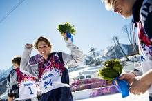 Nick Goepper, Joss Christensen and Gus Kenworthy walk from the flower ceremony after the men's ski slopestyle competition at Rosa Khutor Extreme Park during the 2014 Sochi Olympics Thursday February 13, 2014. Joss Christensen, of Park City, Utah, won the gold medal with a score of 95.80. Gus Kenworthy, of Telluride, Colo., won the silver with a 93.60. Nick Goepper, of Lawrenceburg, Ind., won the bronze with a 92.40. It marked only the third time that the United States has swept the medals in an Olympic Winter Games event.