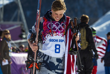 Gus Kenworthy, of Telluride, Colo., celebrates after competing in the men's ski slopestyle competition at Rosa Khutor Extreme Park during the 2014 Sochi Olympics Thursday February 13, 2014. Joss Christensen, of Park City, Utah, won the gold medal with a score of 95.80. Gus Kenworthy, of Telluride, Colo., won the silver with a 93.60. Nick Goepper, of Lawrenceburg, Ind., won the bronze with a 92.40. It marked only the third time that the United States has swept the medals in an Olympic Winter Games event.