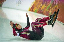 Germany's Monique Angermüller falls while competing in the women's 1,000 meter speed skating race at Adler Arena Skating Center in the during the 2014 Sochi Olympics Thursday February 13, 2014.