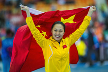 China's Hong Zhang celebrates after winning the women's 1,000 meter speed skating race at Adler Arena