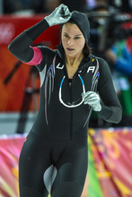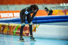 Heather Richardson, of Salt Lake City, reacts after competing in the women's 1,000 meter speed skating race at Adler Arena Skating Center in the during the 2014 Sochi Olympics Thursday February 13, 2014. Richardson finished in seventh place with a time of 1:15.23.