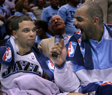 Utah Jazz point guard Deron Williams, left, and power forward Carlos Boozer watch from the bench late in a game against San Antonio as the Jazz lead 105-82 in the 2007 Western Conference Finals.