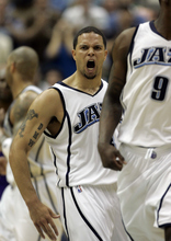 Jazz guard Deron Williams yells during Game 6 of the Western Conference playoffs against the L.A. Lakers at EnergySolutions Arena in Salt Lake City, Utah, Friday, May 16, 2008.