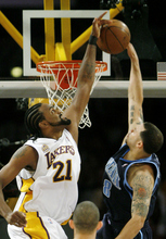 Ronny Turiaf (21)  blocks a shot by Deron Williams in NBA playoff action, Game one at the Staples Center in Los Angeles May 4,  20