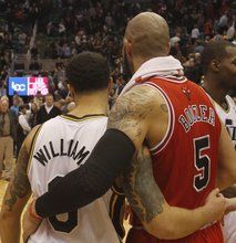 Deron Williams gives Carlos Boozer a hug after the Jazz were defeated by the Bulls, in Salt L