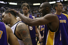 Lakers' guard Kobe Bryant tries to embrace Jazz guard Deron Williams after L.A. eliminated the Jazz in Game 6 of the Western Conference playoffs at EnergySolutions Arena in Salt Lake City, Utah, on Friday, May 16, 2008.