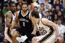 (middle) Brooklyn Nets point guard Deron Williams (8) guards Utah Jazz shooting guard Gordon Ha