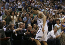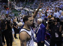 Salt Lake City - Fans cheer and applaud Utah Jazz guard Deron Williams (8) as he leaves the game late in the fourth quarter. Utah Jazz vs. Houston Rockets, game 4, 1st round NBA Playoffs.