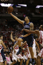 Utah Jazz point guard Deron Williams shoots as he is surrounded by Houston players. The Utah Jazz beat the Houston Rockets 90-84 in Game 2 of their first-round series on Monday, April 21, 2008 at the Toyota Center in Houston.