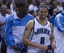 Ronnie Brewer, left, and Deron Williams are all smiles as the Jazz pull ahead late in their win over the Rockets in Game 6.