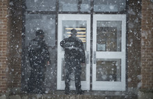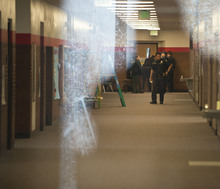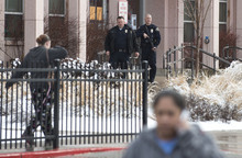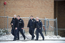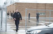 Police search the halls of Sandy Elementary School for a burglary suspect as the school was on lockdown Wednesday, Feb. 19, 2014. Multiple parents had heard word of a bomb threat, which police did not confirm.