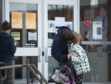 Brenda Larner leaves Sandy Elementary School with her son, Jasmine, after the school went