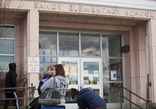 Parents eagerly await to be reunited with their children at Sandy Elementary after the school went on lockdown Wednesday, Feb. 19, 2014, while police searched for a burglary suspect. Multiple parents had heard word of a bomb threat, which police did not confirm.