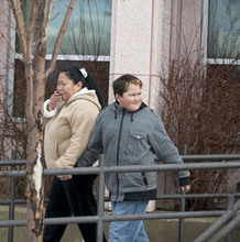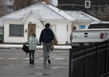 Brenda Larner leaves Sandy Elementary School with her son, Jasmine, after the school went on lockdown as police searched for a burglary suspect Wednesday, Feb. 19, 2014. Multiple parents had heard word of a bomb threat, which police did not confirm.