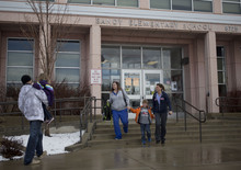 Parents leave Sandy Elementary School with their children after the school went on lockdown as police searched for a burglary suspect Wednesday, Feb. 19, 2014. Multiple parents had heard word of a bomb threat, which police did not confirm.