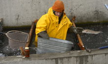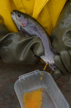 Once a week, he sifts through the rainbows, looking for females ready to spawn. He separates them from the other fish and then one by one, gives them a mild anesthesia, which relaxes them and makes it easier to push the eggs out of their bellies.
