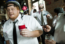 Missionaries Bryan Watson (Bishop Blitz) and Dale Powers (Brother Blackout) dance at Maxwell's East Coast Eatery during the 5th Annual Salt Lake City Urban Iditarod Saturday March 3, 2012. Teams of "dogs" led by a musher pulled sleds -- shopping carts -- through Salt Lake City for about four miles. As an incentive to run, dogs and mushers alike had several "rest stops" at various bars to replenish lost fluids.