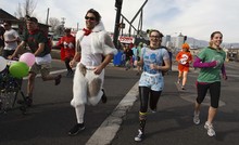 Barnyard Animals run along the route of the 6th Annual Salt Lake City Urban Iditarod, Saturday, March 2, 2013, throughout downtown Salt Lake City. Teams of of mushers pulled sleds in the form of shopping carts from watering hole to watering hole.