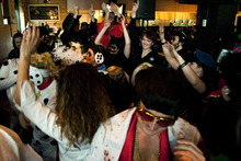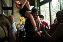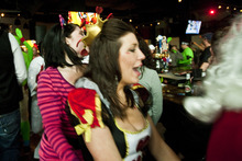 Participants dance at Maxwell's East Coast Eatery during the 5th Annual Salt Lake City Urban Iditarod Saturday March 3, 2012. Teams of "dogs" led by a musher pulled sleds -- shopping carts -- through Salt Lake City for about four miles. As an incentive to run, dogs and mushers alike had several "rest stops" at various bars to replenish lost fluids.