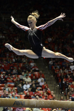 Taylor Keeker and Hannah Casey compete on the uneven bars, and Katelyn Ohlrich competes on the balance beam.