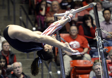 Georgia Dabritz performs on the bars for the Utes, in gymnastics action, Utah vs. Oregon Stat