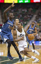 Utah Jazz guard Alec Burks drives by Timberwolves Center Gorgui Dieng in the first half of