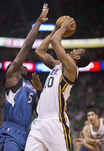 Utah Jazz guard Alec Burks is fouled on his way to the basket by Timberwolves Center Gorgu