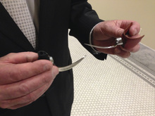 During a recent legislative committee meeting, Humane Society of Utah Director Gene Baierschmidt showed off two weapons or "gaffs" owners attach to the birds' legs. The metal pieces are long, sharp spikes that Baierschmidt said rip the birds apart as they kick at each other. Fans of cockfighting say the blades speed death and make matches more humane, but Baierschmidt doesn't agree.