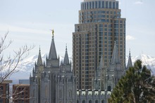 The Salt Lake LDS temple shares the skyline with the Promontory Residential Tower, which is part of the new City Creek development in Salt Lake City.
