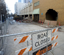 The pictures above show the gradual removal of the buildings currently occupying the UPAC site. It's easiest to follow the demolition of the red brick building on the corner most recently home to Bennion Jewelers but the project also involves removing several smaller structures, as well as the home of the old Salt Lake Tribune printing press.