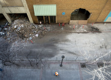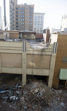 The best way to keep your bearings in the above pictures is to look for the grayish-white Prudential Building, which sits right in the middle of the demolition site. It kind of looks like it has a modern version of flying buttresses at the top. The building is south of the red brick structure and north of The Tribune press buildings.