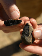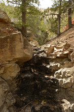 The wash is easily accessible off the Smokey Mountain Road that runs south of town. At its confluence with Alvey Wash, four miles downstream from the spill site, oil damage is apparent. Black goo clings to vegetation growing in the bed. Rocks are spattered with black stains. Disc-shaped tar blobs the size of half-dollars litter the bed. The damage gets worse as the wash winds up through pinyon-juniper and ponderosa forests, until after 2.5 miles where oil deposition forms a nearly unbroken ribbon of asphalt in the stream channel.