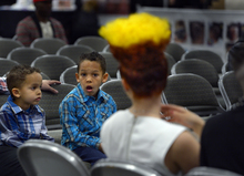 Scott Sommerdorf | The Salt Lake TribuneDavontte' Madera, 7, center, checks out a "Reverse Psycho Billy" hairdo while sitting with his brother Da'Viel, left, at the Golden Shear Hair & Beauty Show. The show will showcase the skills of professionals from Salt Lake County and surrounding areas. It is sponsored by the Journeymens Barber League, Saturday, April 5, 2014.