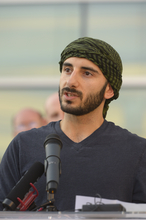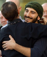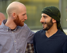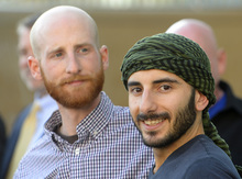 As she spoke, plaintiff Derek Kitchen draped his arm over the shoulders of his partner Moudi Sbeity. The green heart in his hand dangled over Sbeity's chest, emblazoned with the words "Freedom means freedom for everyone."