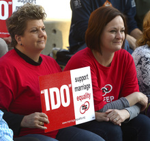Laurie Wood and Kody Partridge, who are also plaintiffs in the case, held hands and smiled to the crowd as politicians, activists and their attorney Peggy Tomsic took their turns at the lectern.