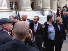 Hundreds of people, mostly Coloradans, gathered outside the courthouse Wednesday evening in a show of support for the Utah plaintiffs Derek Kitchen and Moudi Sbeity; Karen Archer and Kate Call; and Laurie Wood and Kody Partridge.