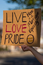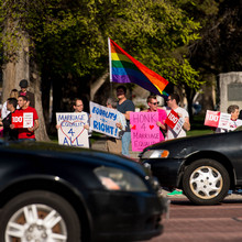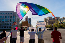 Mewing, a chapter leader for Marriage Equality USA, organized a rally in support of same-sex marriage Thursday. By 5:30 p.m., when the rally officially began, about 30 people held rainbow-adorned signs at the passing rush hour traffic on the corner of State Street and 400 South. The group's goal: to put a human face on same-sex marriage in Utah as three 10th Circuit Court of Appeals judges in Denver decided if the state's ban on such unions should stand.