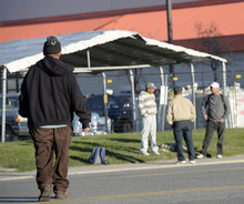 Bad economy • Jeff Liddiard is in the minority among the crowd of workers gathered around Home Depot on any given day. He is a non-Latino U.S. citizen a category that makes up between 10 percent and 20 percent of the group, according to observations over several days. Liddiard says he is a former union carpenter who for years has been unable to find work in a sluggish economy. He is now homeless.