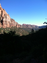 After you leave the dust, you begin walking up what looks like a desert oasis between gorgeous red rocks. Walk a little higher and turn around, and you'll have a panoramic, yet up-close view of red and green mountains.