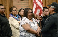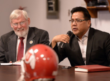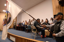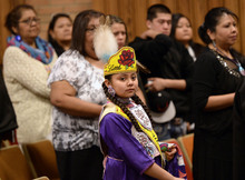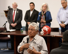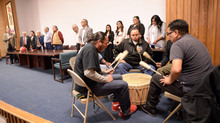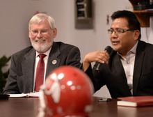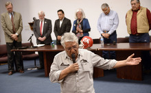 U. leaders stood Tuesday while the Red Spirit drum group opened the proceedings and a prayer was delivered by tribe elder Leo Tapoof after a short speech that he ended with "Go Utes!"