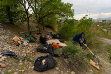 Salt Lake County Health Department and inmates doing community service spent the day cleaning out homeless encampments on the north side of Salt Lake City, Tuesday April 22, 2014.