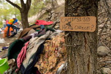 A sign at the entrance to an encampment. Salt Lake County Health Department and inmates doing community service spent the day cleaning out homeless encampments on the north side of Salt Lake City, Tuesday April 22, 2014.