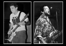 Two images of Mike Watt. On the left he performs with Minutemen at the Utah State Fairgrounds Coliseum in 1985. On the right he is seen in Mike Watt with fIREHOSE at Speedway Cafe, October 27, 1989.