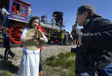 New York photographer Corky Lee, right, works with dancer Wan Zhao near one of the two locomotives used in the re-enactment of the Golden Spike ceremony, Saturday, May 10, 2014. The Chinese community honored Chinese immigrants who built the railroad from the west by taking more than three busloads of people to the Golden Spike National Monument for the 145th commemoration of the completion of the transcontinental railroad.